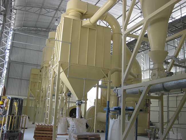 形狀較大的陶土首先由破碎設備破碎成陶土磨粉機所需粒度,斗式提升機負責將經過破碎加工的陶土送入儲料斗,之后使用振動給料機將儲料斗內的物料送進陶土磨粉機主機磨室內,經過磨輥與磨環的相互作用實現物料的破碎,粉磨完成后,經過粉磨的物料粉子在鼓風機的作用下進入選粉機,選粉機選出符合粒度要求的陶土物料,進入成品收集器內,不符合要求的陶土物料重新返回磨室內進行磨粉加工。
